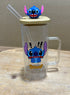 Square shape glass mug with wood lid and glass straw, blue stitch print